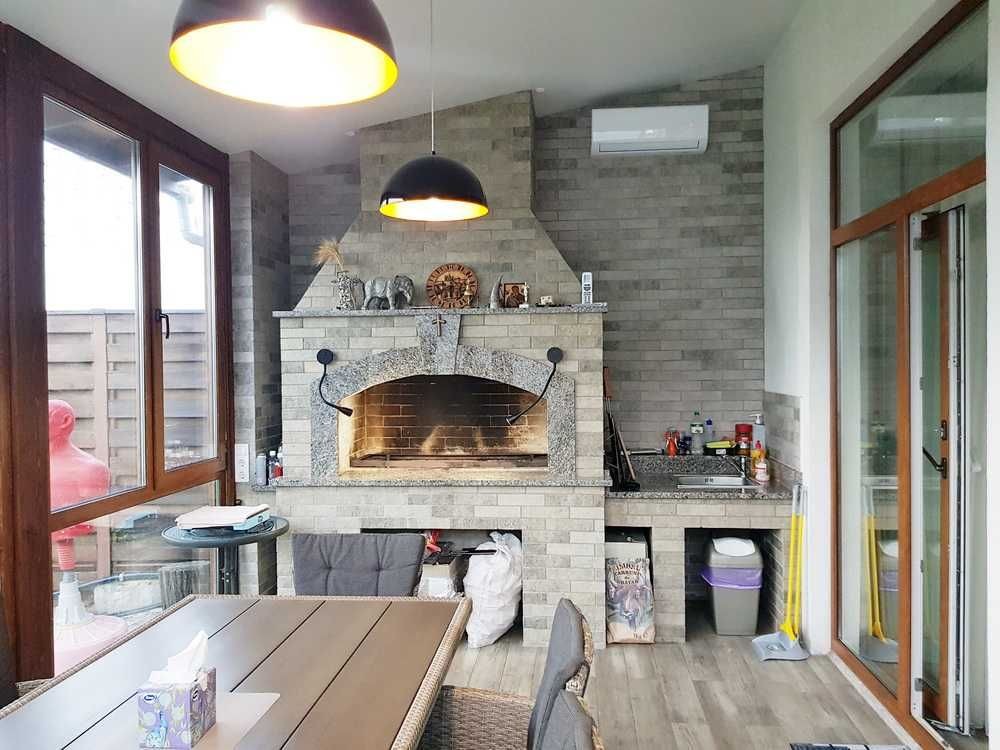 Огорожен капитальным забором, газон с авто поливом, туи, тротуарная плитка на дорожках, крытый паркинг на две машины, автоматические ворота, вечерняя подсветка территории, отдельно стоящий домик с шикарной остекленной террасой и зоной барбекю + огромная гостиная студия со своей кухней и действующим камином. Может использоваться как для отдыха так и для автономного проживания родителей или для гостей,