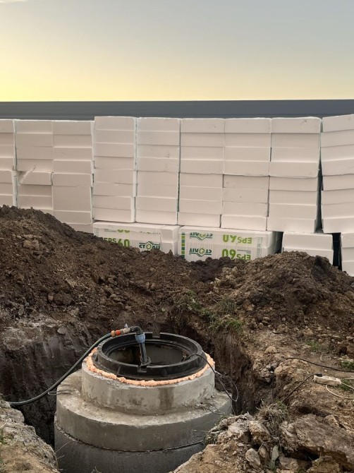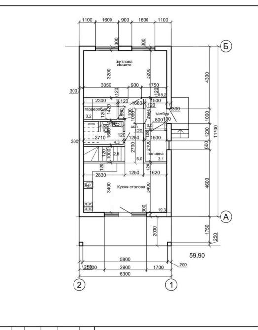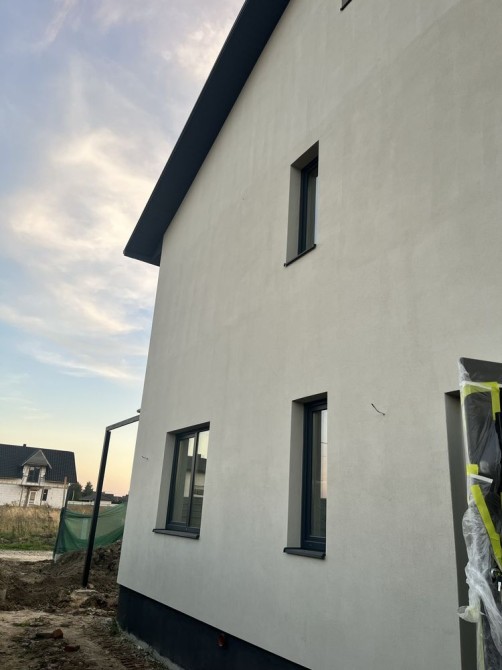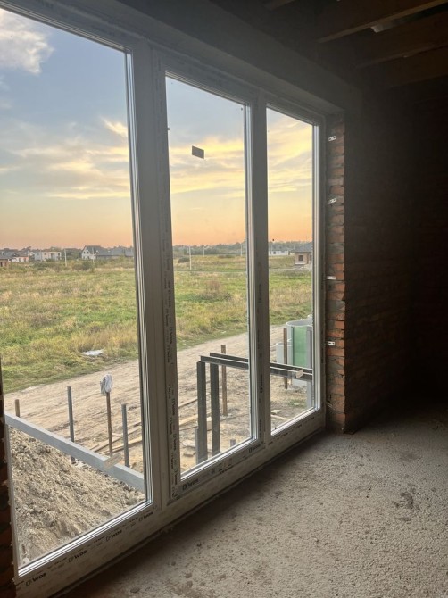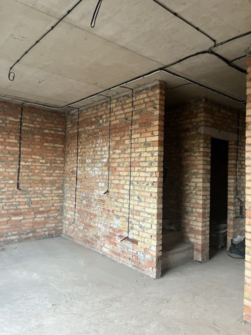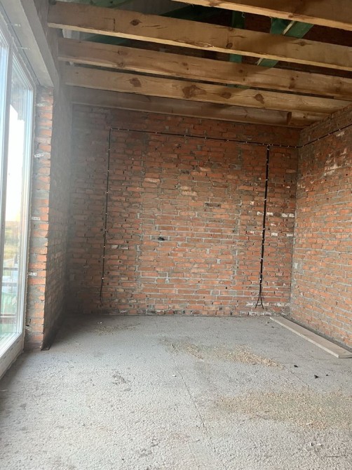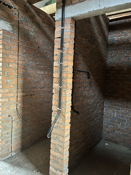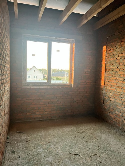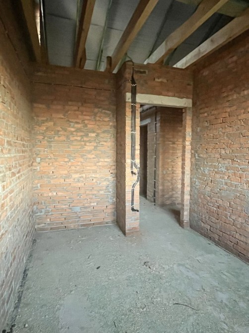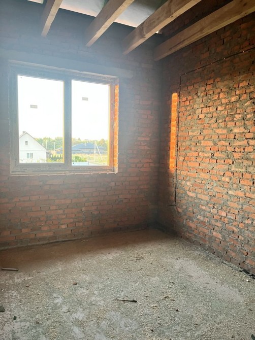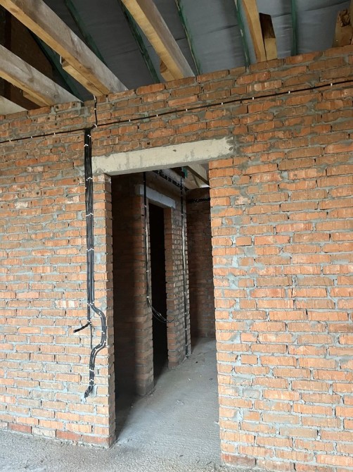 Будинок побудований з червоної цегли, утеплений пінопластом 15см. На першому та другому поверсі розведена сантехніка, електрика, прокладена по усій площині будинку тепла водяна підлога, залита стяжка та зроблена штукатурка стін.