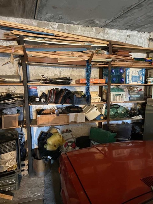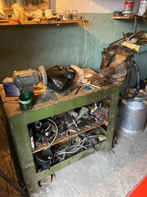 Металевий верстак с тісами, багато стелажів і вздовж стін і над воротами