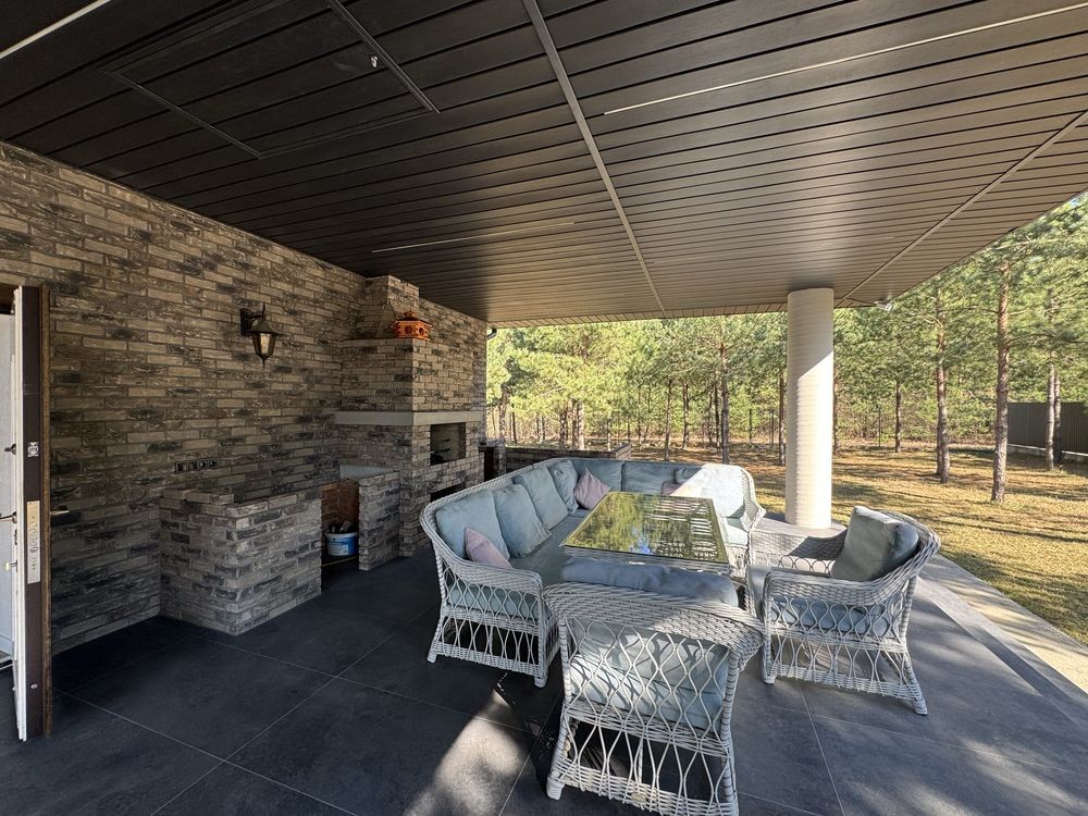 Гостьовий будинок: стіни цегла 38 см, утеплення будинку перліт 10 см, облицювання цегла ручного формування Vandersanden Бельгія. Монолітне перекриття 20 см, пінопласт 20 см, стяжка 8 см, натуральна черепиця Jacobі. Вікна Rehau Synego, 80 профіль. Електричний котел Protherm 6кВт. Система очистки води Eco Soft, бойлер 80л. Опалення гостьового будинку - тепла водяна підлога та піч.