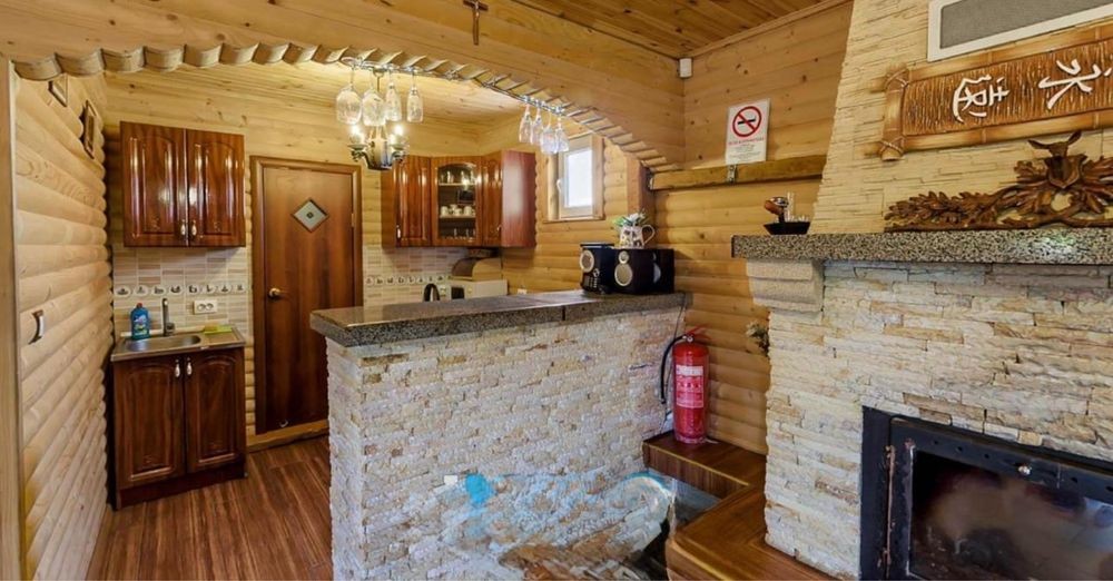 Котедж має терасу, хол, кухню, 2 санвузли, балкон, терасу, сауну та римську парну, душову. Є камін, який опалює весь будинок.