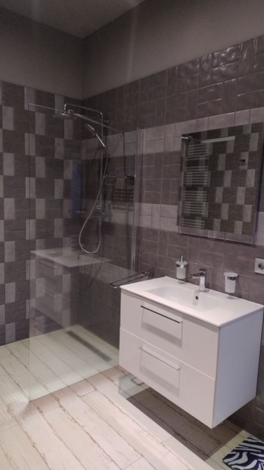 Санвузли: сучасна сантехніка, оздоблення у світлих тонах.