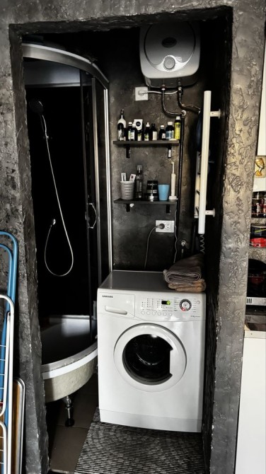 В кімнаті душова кабіна та пральна машина, холодильник, мікрохвильовка, два столи, міні бойлер на 14 л.