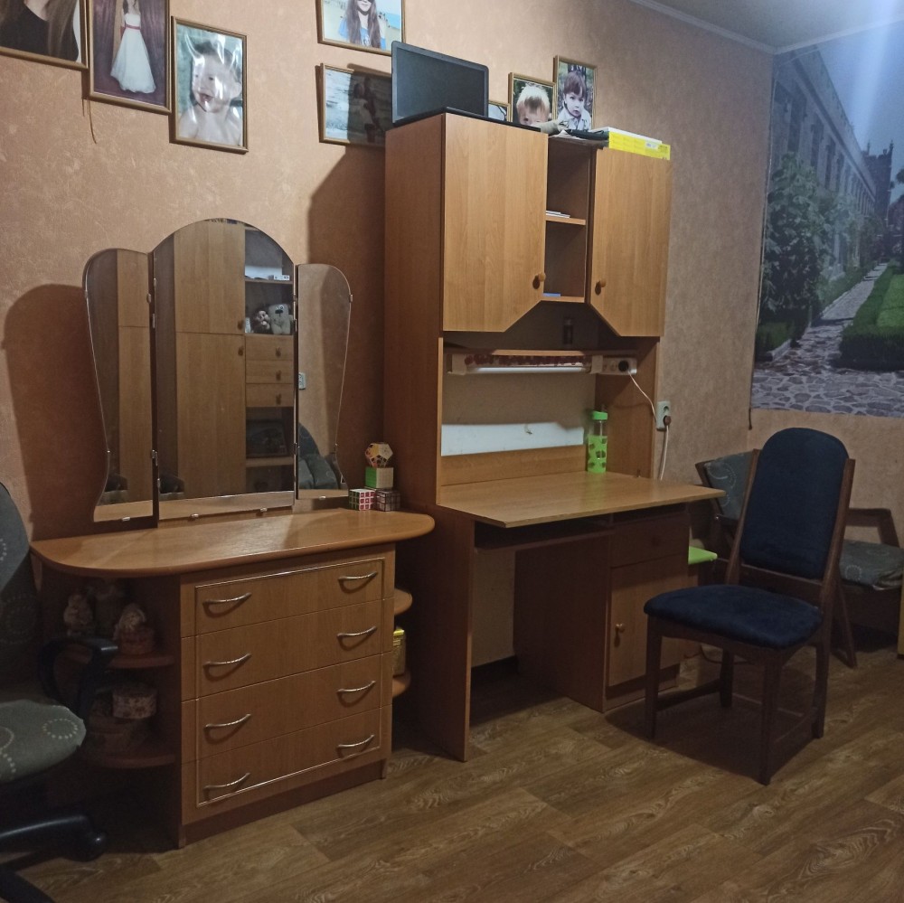 Вторая детская для девочки - удобный раскладной диван, компьютерный стол, шкафы обычные, 2 шкафа-гардероба, трюмо для макияжа.