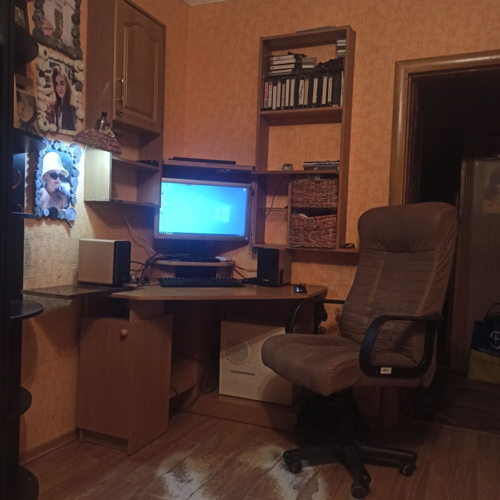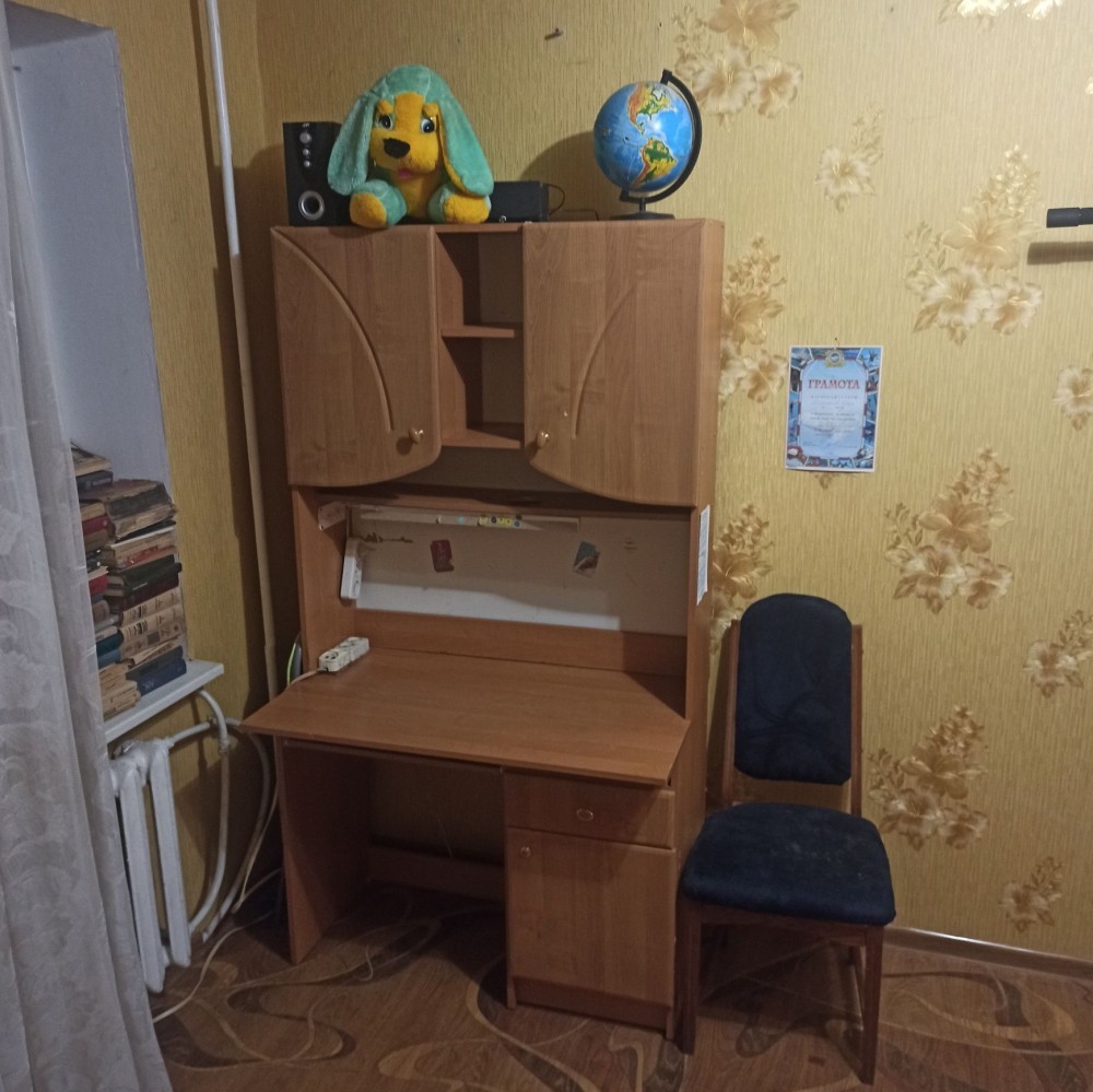 Зал - большая двуспальная кровать, очень удобный угловой компьютерный стол, шкафы.