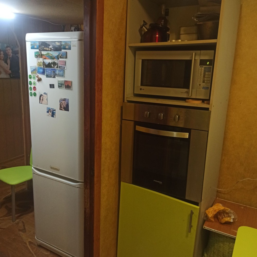 Кухня - микроволновка, хлебопечка, плита, вытяжка, кондиционер, шкафчики-пеналы, холодильник, большая морозильная камера в человеческий рост. Уголок старый - будет заменен на новый до вашей оплаты.