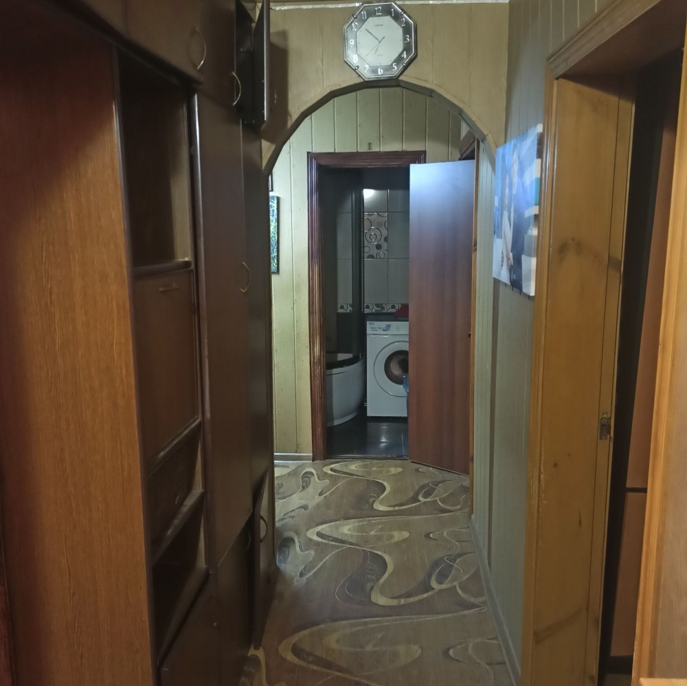 Коридор - Тяжелая дубовая входная дверь, вторая входная дверь - для звукоизоляции. В коридоре длинный шкаф на всю стену - очень много полочек. Есть отдельный шкаф для обуви. Также есть турник.