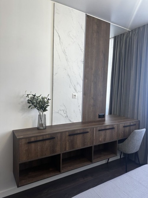 Встроенная техника, бойлер, стиральная машина, посудомойка, кондиционер, телевизор . Техника Samsung и Gorenje. Много мест хранения . 3,5 метров шкаф в прихожей , с секциями для хранения одежды и обуви и хоз. инвентаря , большой шкаф в сан узле и спальне .