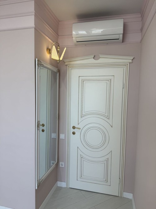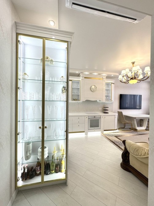 В квартире две спальни, два санузла (ванная и душевая), кухня объединенная с гостинной, гардеробная , балкон утеплен и оборудован под прачечную (стиральная, сушильная машина BOSCH), просторный холл с зеркальным панно. В санузлах теплый пол, частично теплые стены, 3 индукционных кондиционера, мебель сделана по индивидуальному заказу, двери «дерево» с итальянской фурнитурой на магнитных замках, розетки и выключатели Schneider . Установлена охрана системы AJAX. Пространство квартиры зонировано освещением.