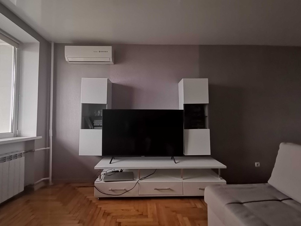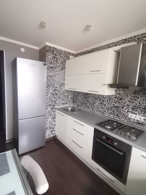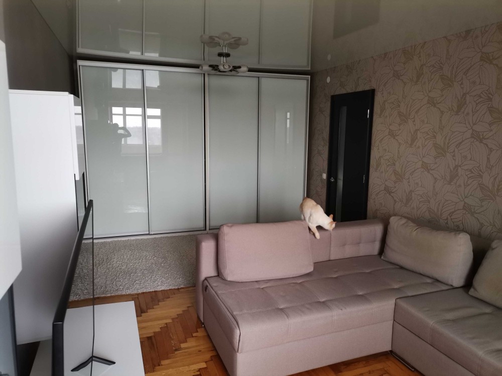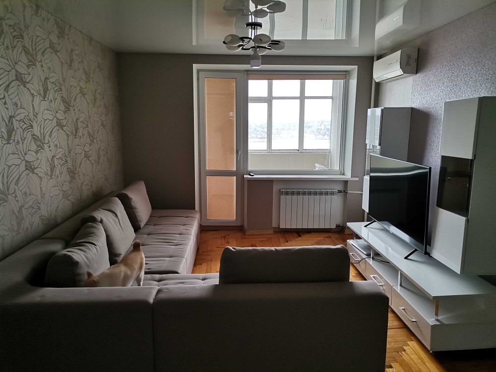 Кухня со всей встроиной техникой(духовка bosch, микроволновка Samsung, вытяжка, система очистки воды осмос, инвертор ный холодильник Samsung и маленький телевизор.) стол из стекла и метала раскладной 2.5 метра. Бойлер, кондиционер, стиральная инвертор ная машина LG. Комнате телевизор 55 дюймов Samsung тумба под него. Рулонные шторы на всех окнах.