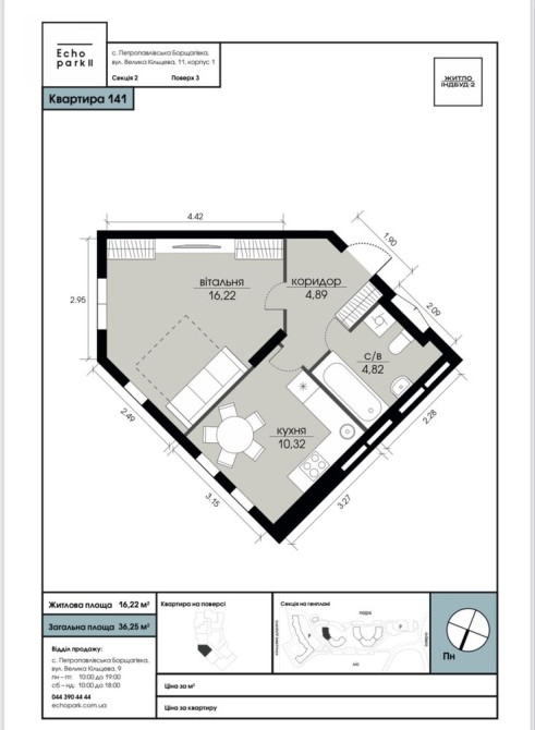 Пропонується 1-кімнатна квартира площею 36,25 м² у сучасному житловому комплексі Echo Park.