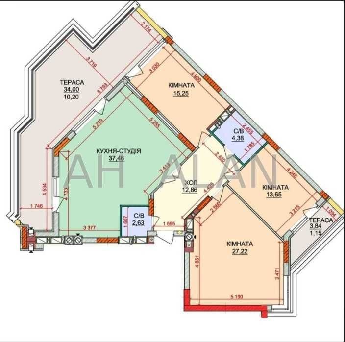 Планування: кімнати — 27 м², 14 м², 16 м², кухня — 37 м², два санвузли, дві тераси — 34 м² та 4 м², хол — 13 м².