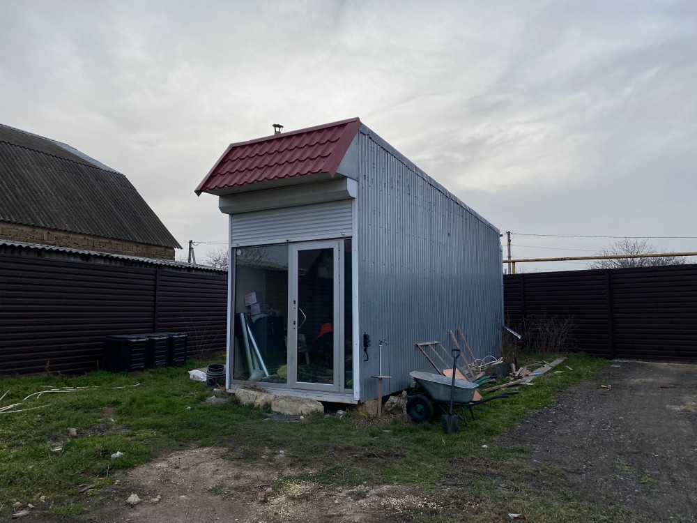 Внутри утеплен, общит вагонкой. Есть разводка свет, розетки.