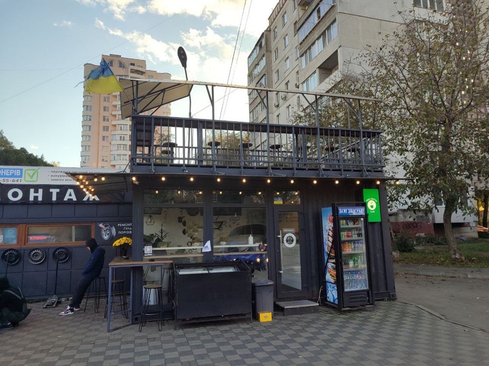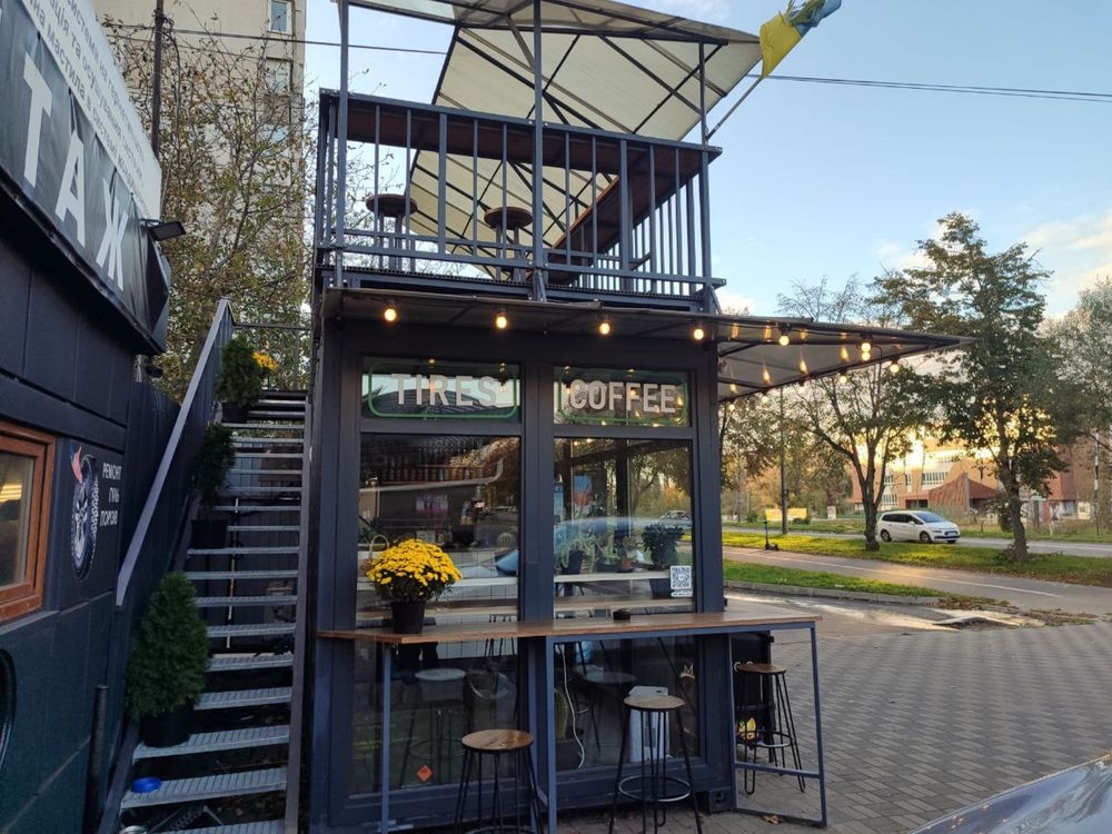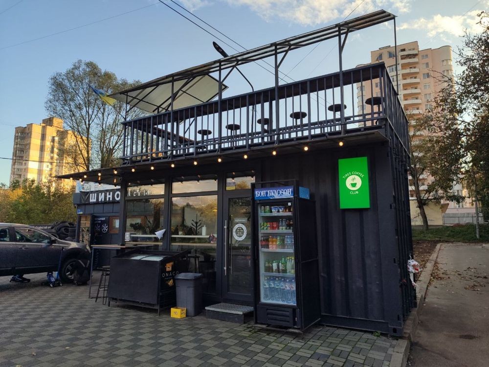 Кавʼярня побудована на основі морського контейнера в 22 році, це індивідуальний проект, маф має два поверхи, побудовано все так щоб можна було розбирати( тобто все на болтах) каавʼярня працювала майже 3 роки за цей час ніяких питань не виникало в плані теплоізоляції чи промерзання, підлога залята стяжкою та покладена плитка, стіни осб фарбованна, мінвата 100мм на терасу пішло +- 3 тонни металу( перила основа для сходів і т далі!