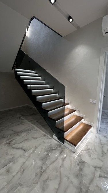 Лестница обшита деревом в комбинации со стеклом.
