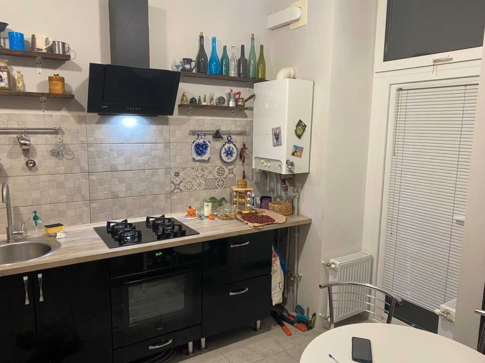 Нестандартна однокімнатна квартира в самому центрі міста. Висота стелі 3.75 м. Є зона відпочинку.