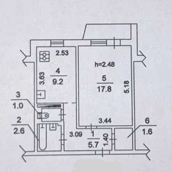 Загальна площа квартири 40 м.кв, житлова 17,8 м.кв., площа кухні 9,2 м.кв.