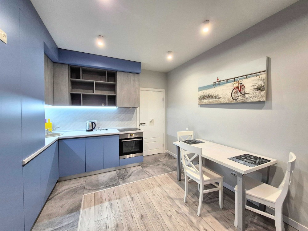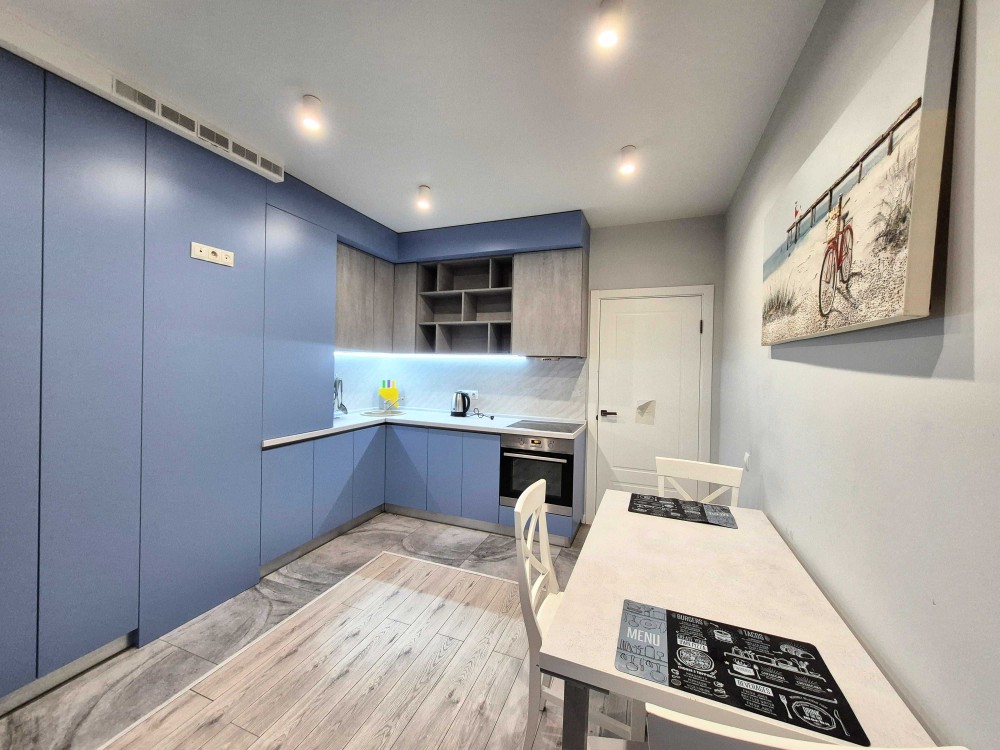 -кухня-студія: розкладний диван, вбудована кухня (плита, духова шафа, витяжка, посудомийна машина, мікрохвильова піч, двокамерний холодильник), великий розкладний стіл та стільці