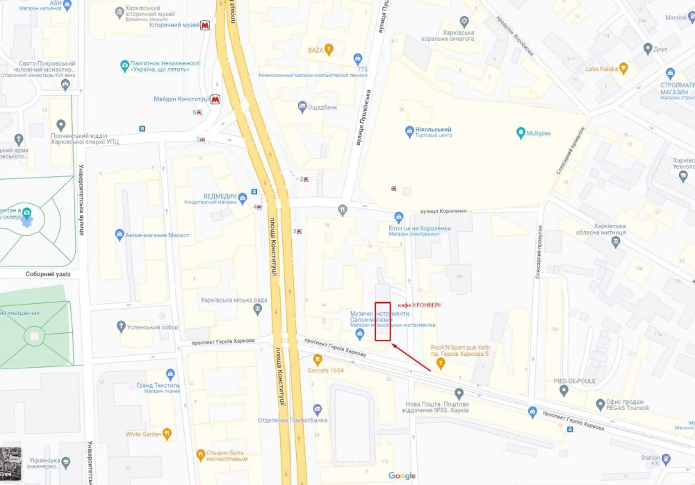 Продам приміщення колишнього кафе "Кронверк" у самому центрі Харкова, пр. Героїв Харкова,3. Приміщення розташоване в повоєнному сталінському будинку з залізничними перекриттями і має презентабельну вхідну групу з широкими кам'яними сходами, можливе використання як для торгівлі, представництва, так і під банк, медичний центр, офіс. У безпосередній близькості знаходяться ТРЦ "Микільська", Міськрада, незліченна кількість кафе, банків, офісів, магазинів, вихід зі станцій метро "площ. Конституції" та "Історичний музей". У приміщення заведено окремий кабель від підстанції на 70 кВт. Внаслідок проведення бойових дій цей будинок не постраждав. Якщо ви шукаєте просторе приміщення в історичному центрі Харкова – чекаємо на вас!