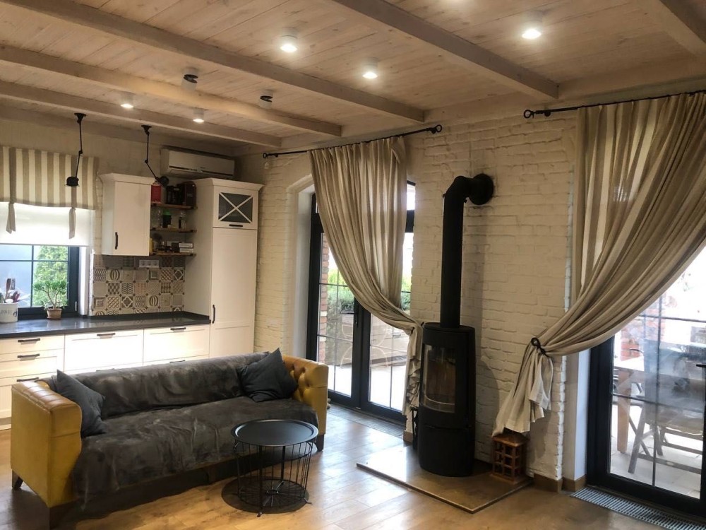 гостиная (с камином) и с выходом на крытую террасу 25 м2.