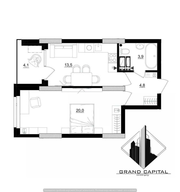 • Кухня-вітальня — 13 м² із виходом на лоджію, яку можна облаштувати під зону відпочинку чи кабінет.