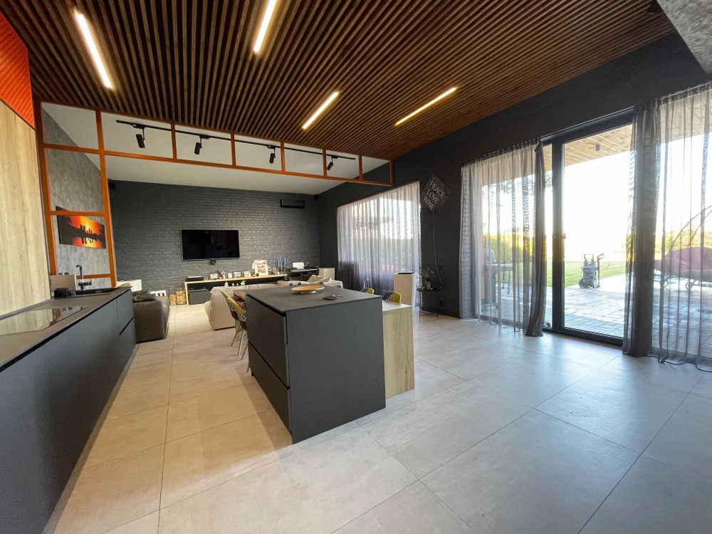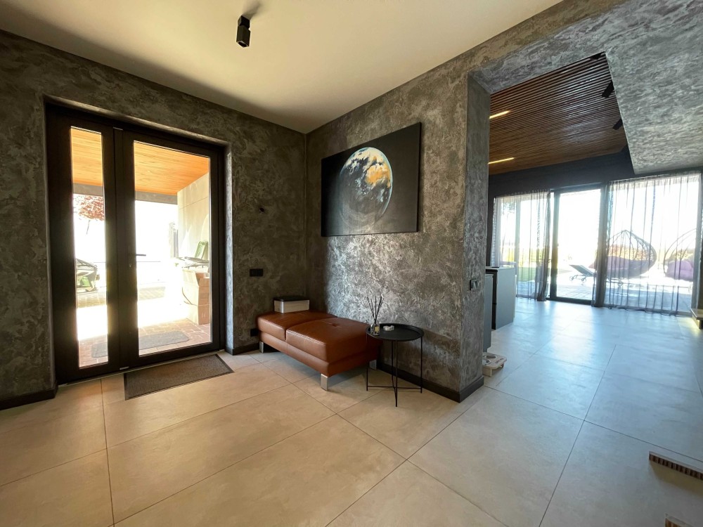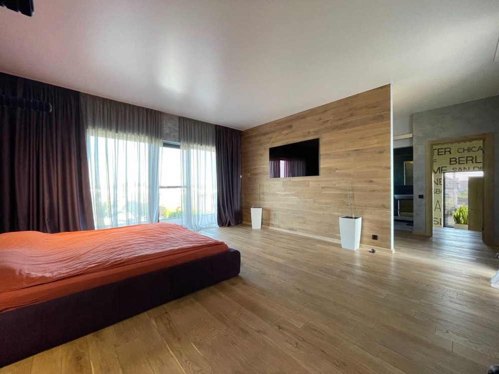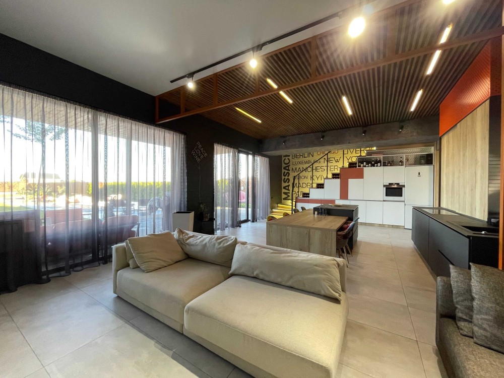 На 1 поверсі: велика кухня вітальня 60 кв.м з виходом на накриту терасу із зоною барбекю та лаунж зоною, гостьовий санвузол, пральня, котельня. На 2 поверсі 2 спальні кімнати зі своїми вбиральнями та ванними кімнатами.