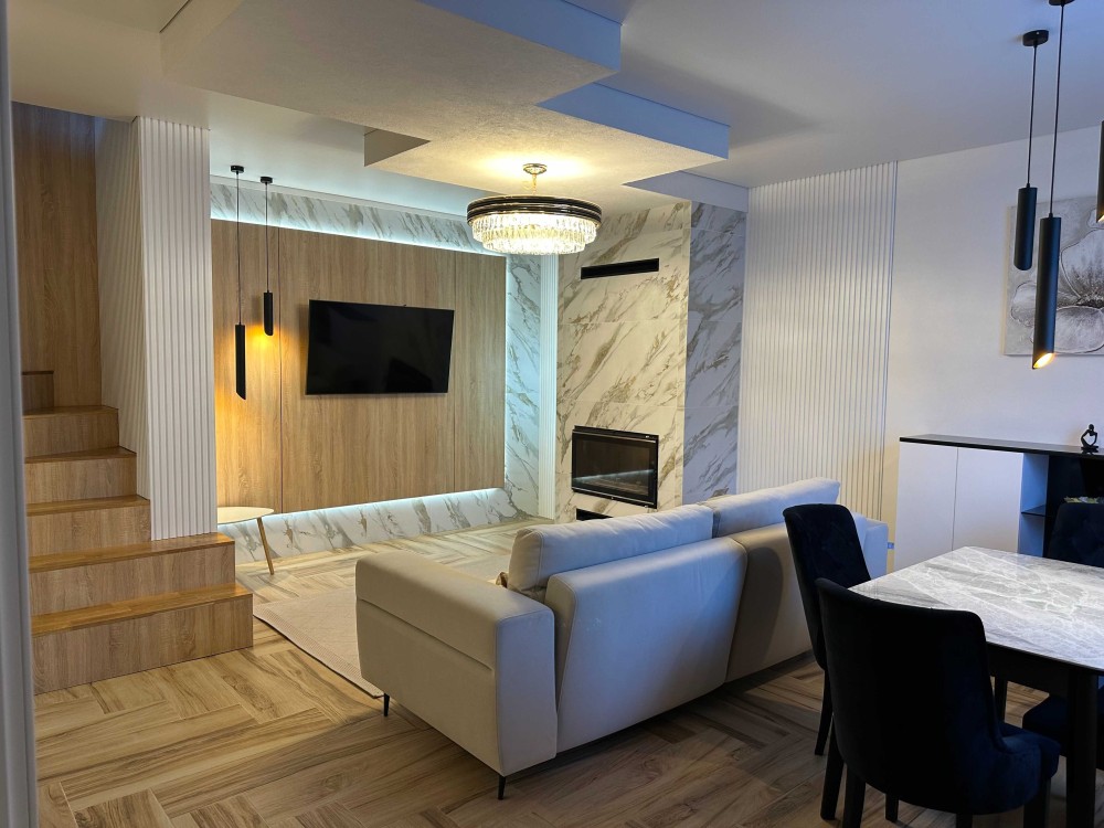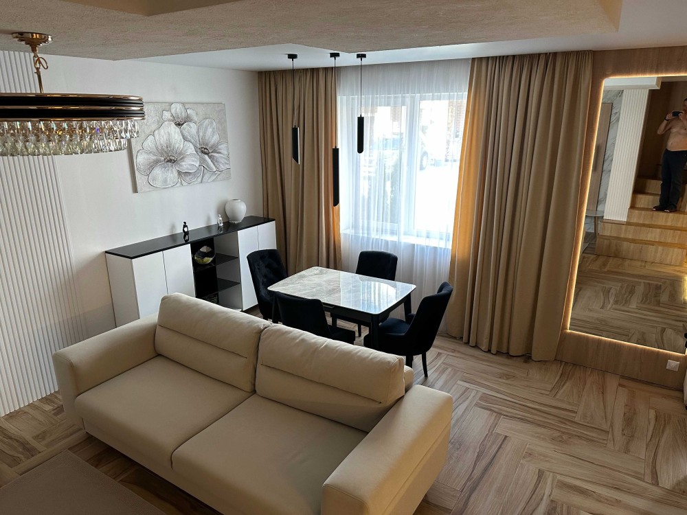 Продам танхаус площею 95 м2. Стіни червона цегла, утеплений пінополістіролом та оздоблений плиткою. Теплі двері та металопластикові вікна. Обігрів: електрична підлога (6 точок регулювання, тепле підвіконня). Офіційно оформлено електричне отоплення (з жовтня по травень тариф на світло 50%). Трьохфазний двохзонний лічильник, дозволена потужність 15 кВт. Електропроводка повністю мідна. Перший поверх: вітальня, кухня, середпокій, пральня і кладова. На першому поверсі є камін 18 кВт (камін обігріває 1 поверх та 2 поверх за допомогою спеціального виведених воздуховодів - вихід на другому поверсі в підлозі). Деревяні дубові сходи на 2 та 3 поверх (автоматичне при русі ввімкнення світла на сходах. Стеля в усіх кімнатах натяжна матова с тіньовим профілем. Зони, меблі та кухоний острівець з світодіодною підсвіткою підсвіткою. Підлога керамогранітна плитка. Дом теплий, сусіди мешкають з трьох сторін, одна стіна наружна. 2 паркомісця перед будинком. Другий поверх 2 спальні та санвузол. Третій поверх стеля утеплена мінеральною ватою, стіни пошпакльовані під оздоблення (покраска або інше) вентиляція, освітлення (використання на розсуд нових власників). Підключений інтернет маклаут. Територія комплексу зачиняється, двоє воріт відкриття за допомогою чипу або телефоним дзвінком. Меблі та побутова техніка залишається. Школа, дитячий садок, магазіни, аптека, віддлення нової пошти в радіусі 250 метрів. Зданий в експлуатацію 2021 року. Площа зімельної ділянки мається на увазі участок на якому стоїть будинок та паркомісця перед будинком. Щодо розташування - знаходиться на вулиці Руставі в ЖК Вишневий поблизу відділення 700 Нової пошти
