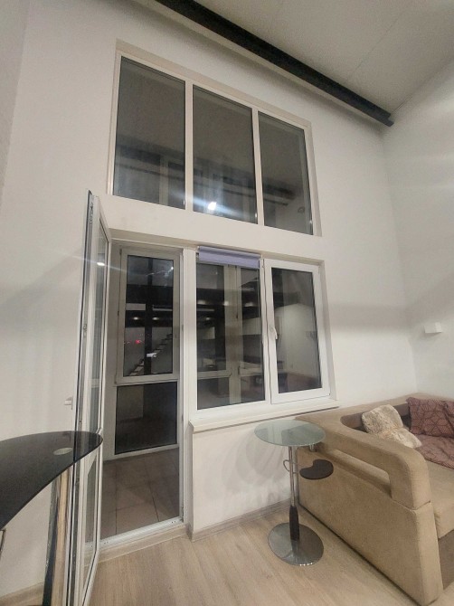 На першому поверсі розташовані кімната-студія з кухнею площею 25 кв.м., санвузол 5 кв.м., гардеробна 4 кв.м. і лоджія 5,7 кв.м.