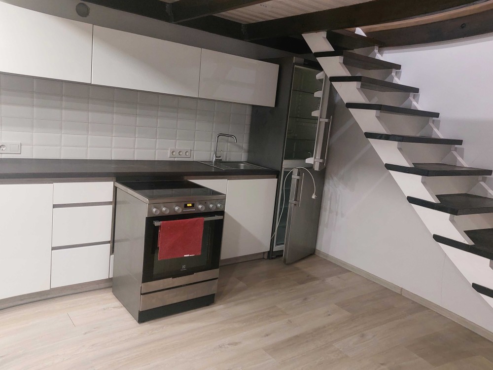 Квартира дворівнева. На першому поверсі розташовані кімната-студія з кухнею площею 25 кв.м., санвузол 5 кв.м., гардеробна 4 кв.м. і лоджія 5,7 кв.м.