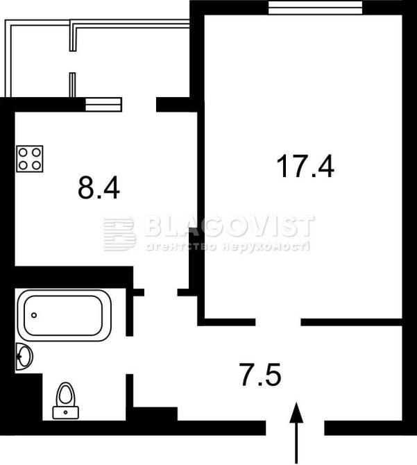 1 кімн., 23-й поверх, площа: 42,0\17,4\8,4м2.