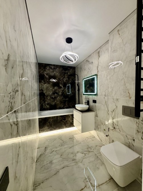• Преміальна ванна кімната: Оздоблення великоформатним керамогранітом під мармур, контрастна чорна сантехніка та стильна підсвітка під ванною створюють атмосферу дорогого готелю.