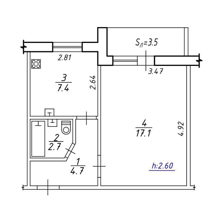 • Площа кухні 7.4 м2