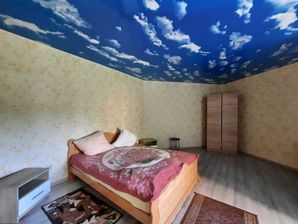 У кімнаті на стіні поклеяні обої, стеля натяжна, кімната доволі велика, є місце для розміщення великої шафи для речей.