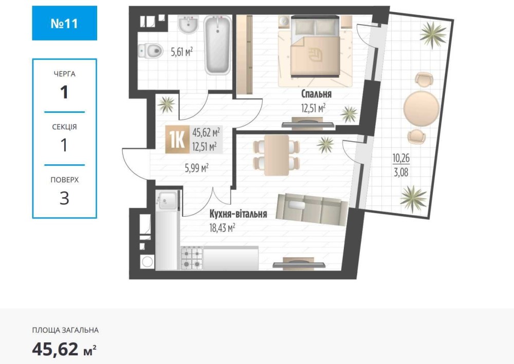 • Загальна площа 45.62 м2