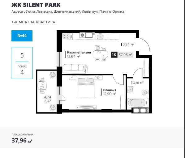 Загальна площа квартири – 37,96 м², житлова – 12,9 м², кухня – 13,64 м². Висота стелі – 2,8 м.