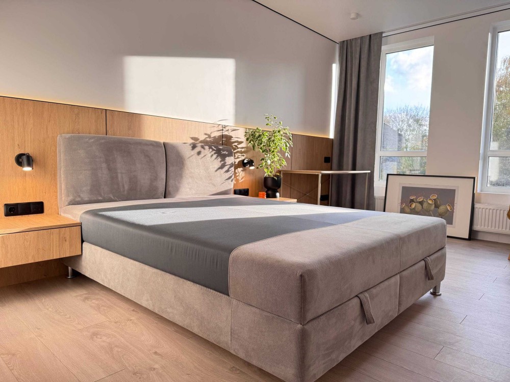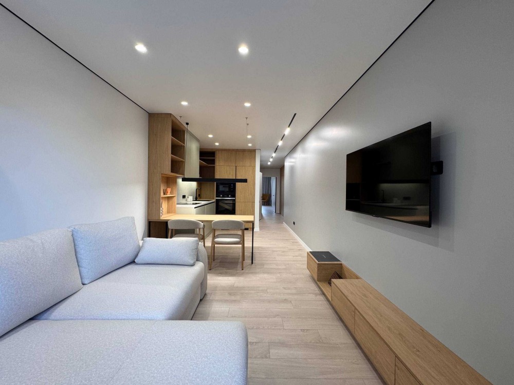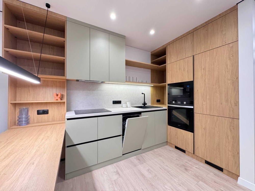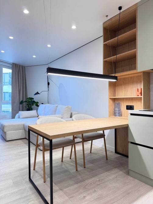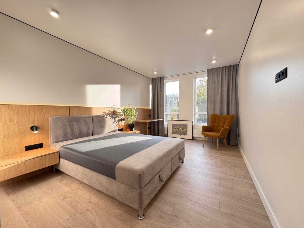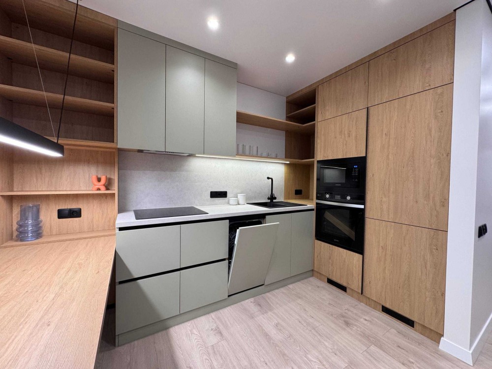 Простора кухня-студія із необхідною вмонтованою побутовою технікою (посудомийна машина, варильна поверхня, мікрохвильова, духова шафа та холодильник). Також є кондиціонер. Велика спальна кімната із комфортним двоспальним ліжком, гардеробною та косметичний столик.