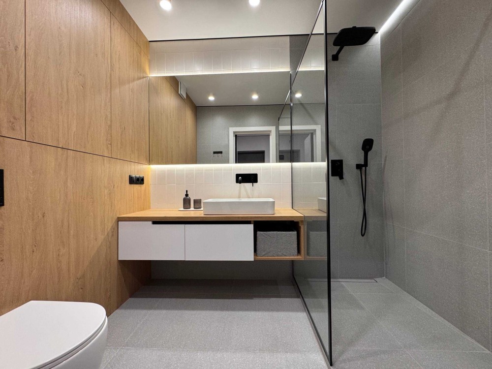 Санвузол укомплектований душовою, вмонтований туалет, рушникосушка, дзеркало з підсвіткою, тепла підлога.
