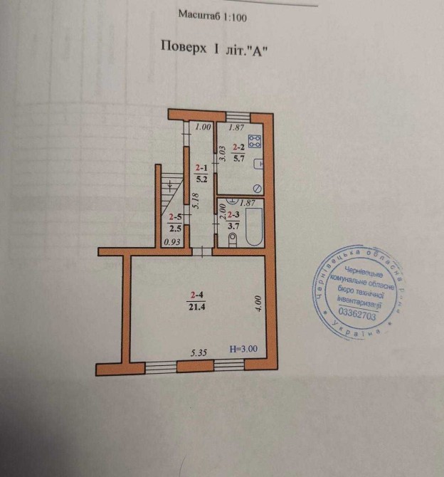 Квартира розташована на 1-му поверсі двоповерхового будинку, має площу 38,5 м². Стан під ремонт — можна облаштувати все на свій смак.
