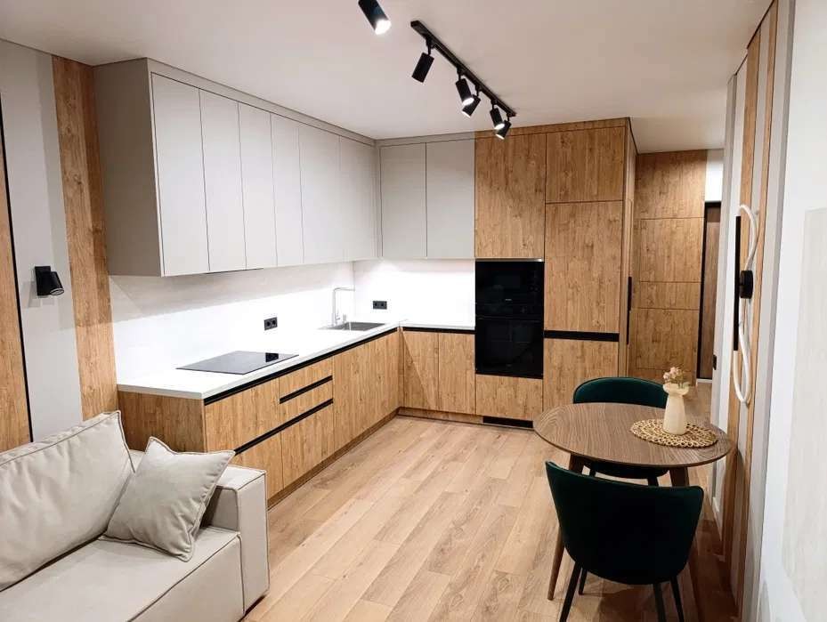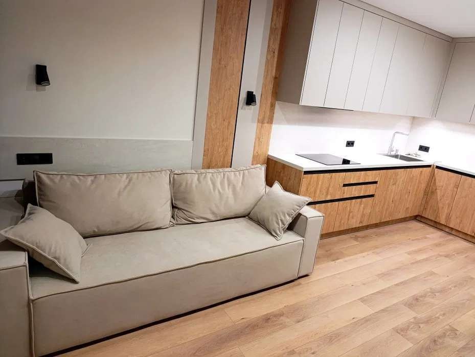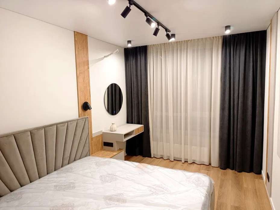 Диван, ліжко, стіл та стільці з масиву дерева. Натяжна стеля з тіньовим профілем. Багато варіантів освітлення.