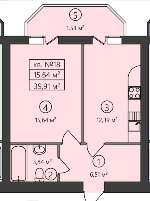 • Площа кухні 12.39 м2