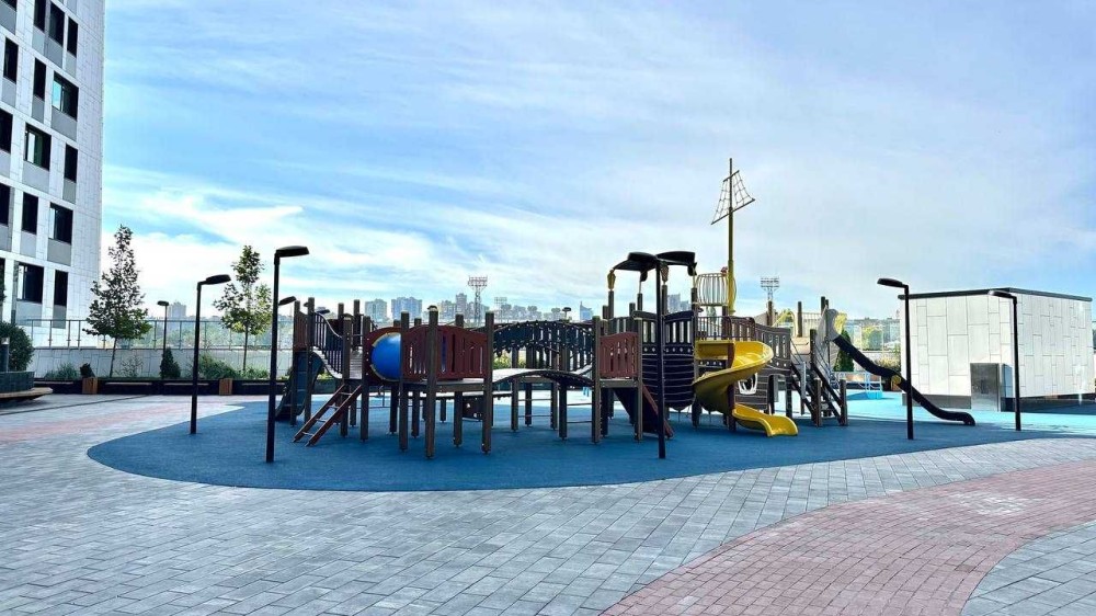 між трьома будинками розташований стелобат з дитячими та спортивними майданчиками, зонами відпочинку для мешканців;