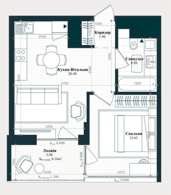 • простора кухня-вітальня (20.49 м²)