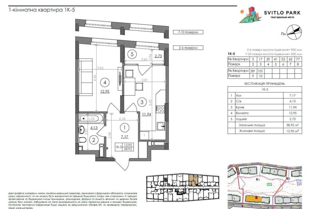 Планування: окрема спальня — 12,95 м², кухня-вітальня — 11,94 м²