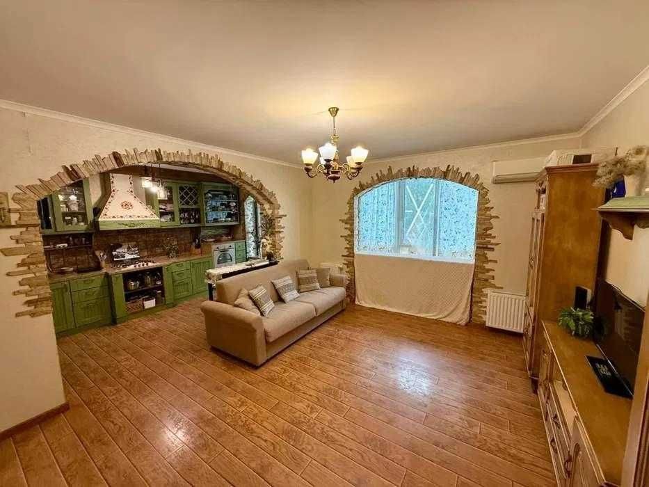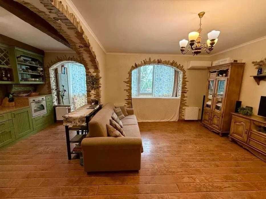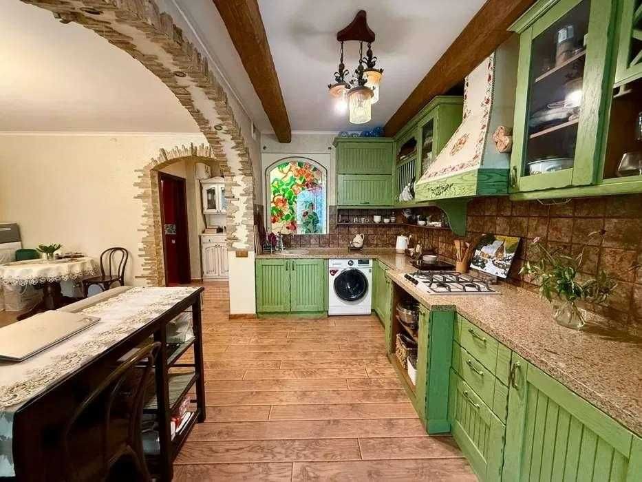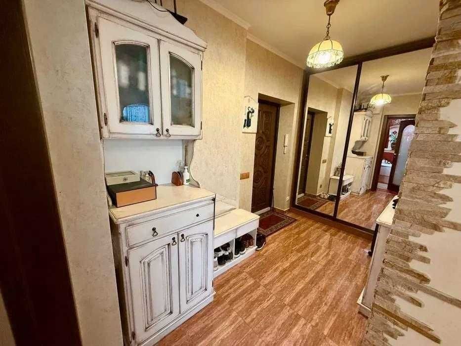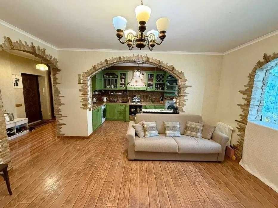 Ремонт виконаний у класичному стилі з використанням якісних матеріалів. Індивідуальний кухонний дизайн, техніка Franke. На стінах — венеціанська штукатурка, декоративні дерев’яні балки створюють атмосферу затишку. Встановлений бойлер, велика шафа-купе, броньовані вхідні двері.