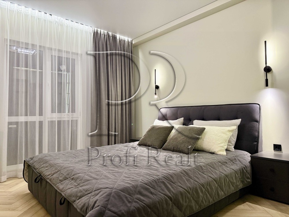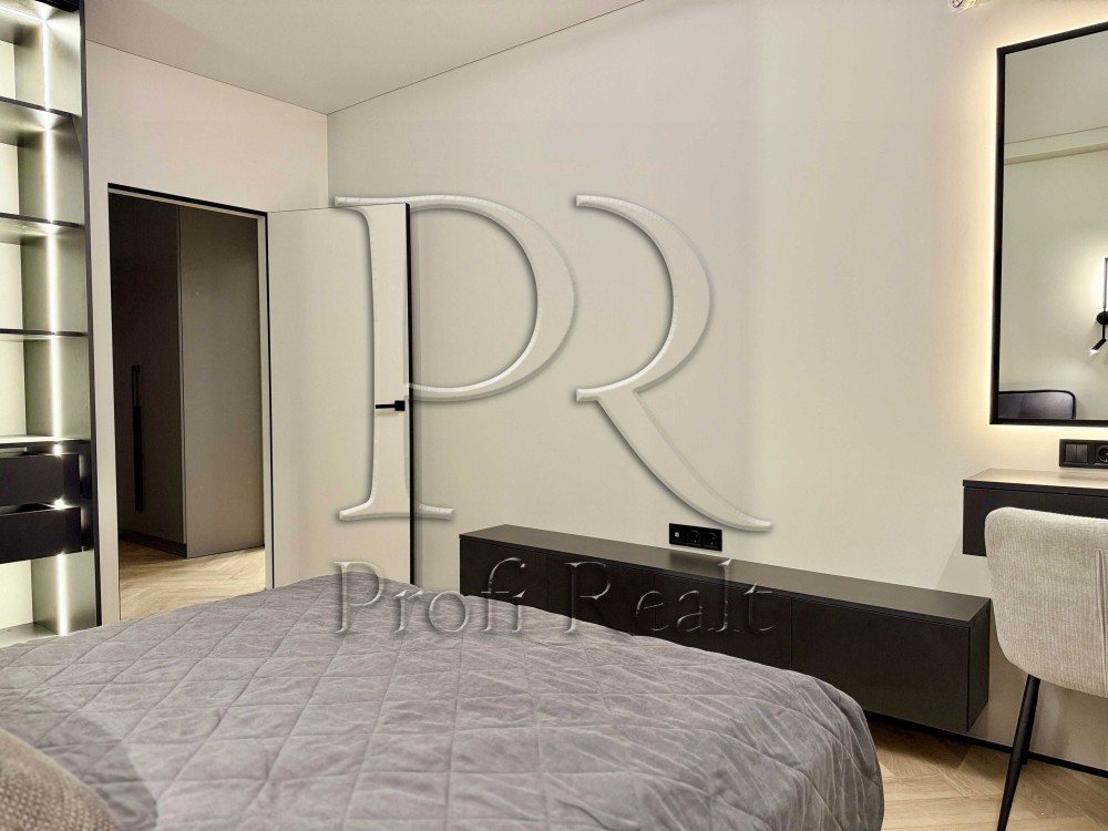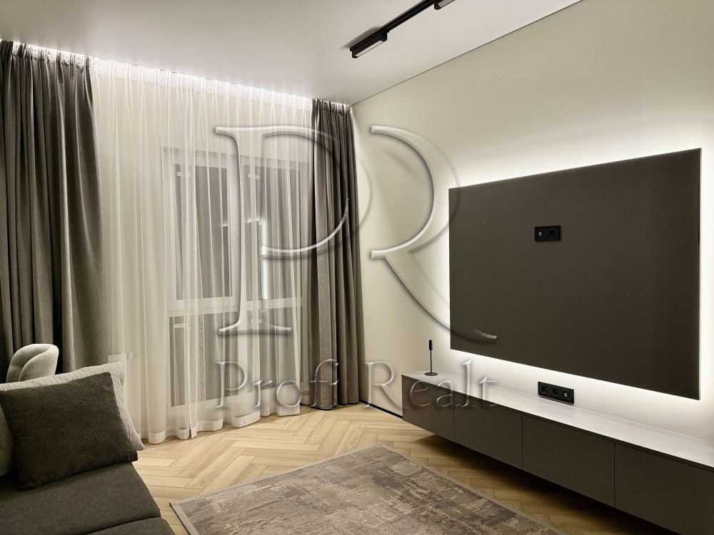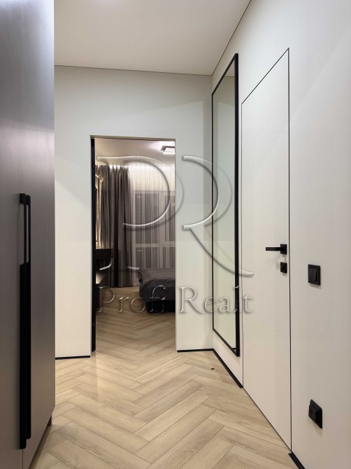 Натяжна стеля (бельгійське полотно, преміальної якості), по всій квартирі тіньовий профіль, а також алюмінієвий міні плінтус. Двері прихованого монтажу.
