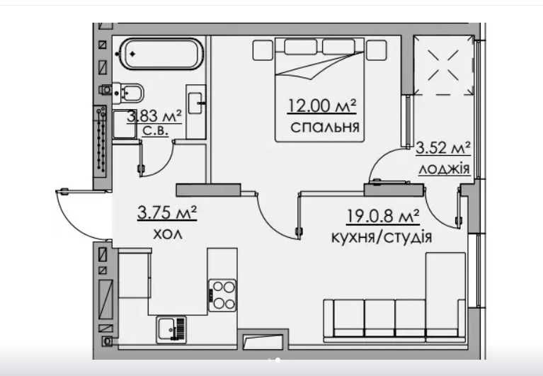 Загальна площа квартири 42,18 кв. м, житлова 12 кв. м, кухня 19,08 кв. м. Квартира знаходиться в першому будинку на чотирнадцятому поверсі. Правильне планування дозволяє функціонально використовувати простір. Із кімнати та кухні вихід на закриту лоджію. Простора кухня-студія із можливістю зонування на робочу та відпочинкову частину. Ізольована кімната. Квартира внутрішня із східним розташуванням. Автономне будинкове опалення. Суміжний санвузол. Монолітно-каркасна технологія будівництва, цегляні стіни, зовнішнє утеплення мінеральною ватою. Планований термін здачі - осінь 2025 року.