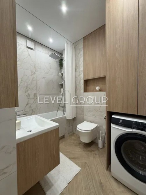 У ванній кімнаті — ванна, гігієнічний душ, прально-сушильна машина, бойлер і багато місць для зберігання.