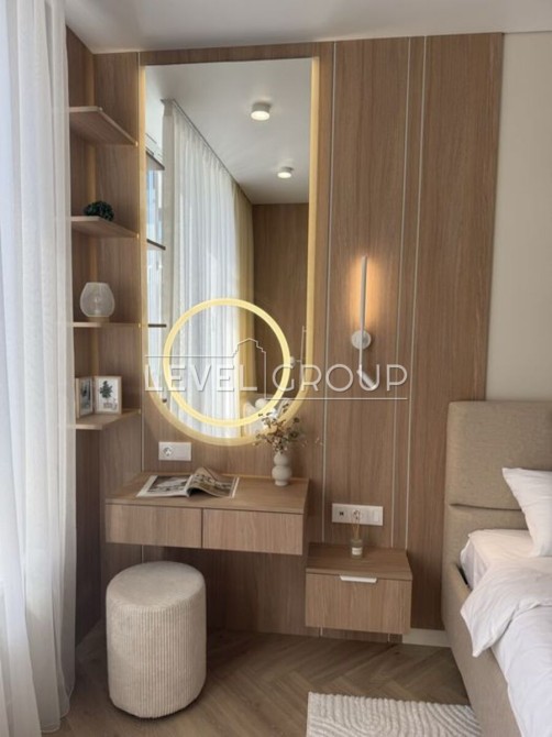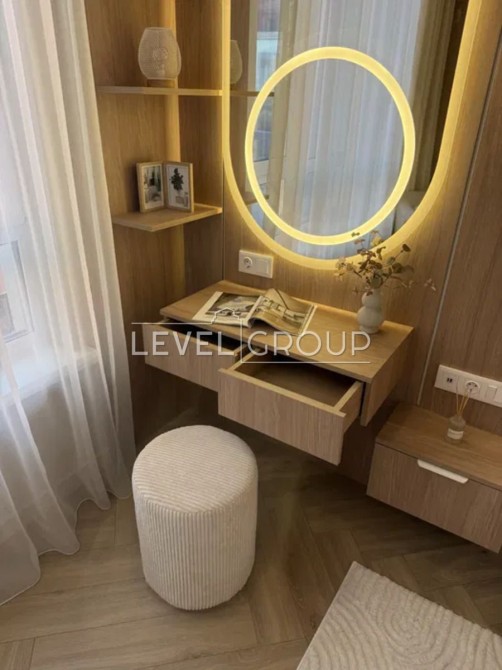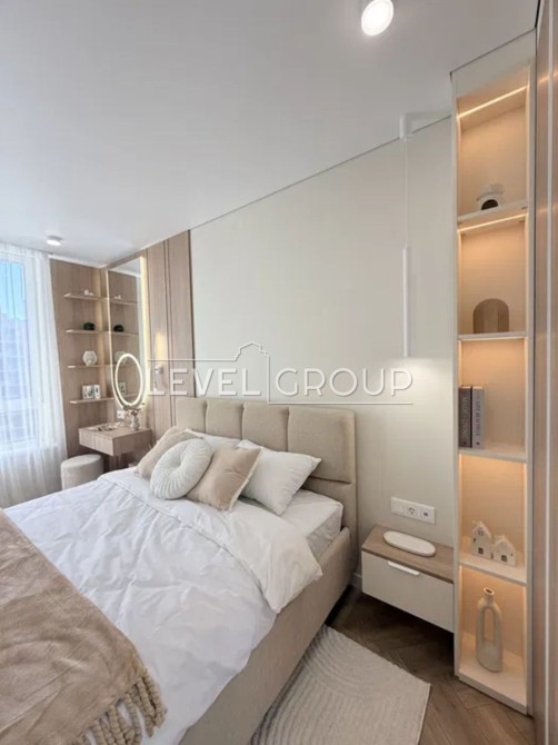 У спальні розміщено вбудовану шафу, велике ліжко з підйомним механізмом, робоче місце та куточок для читання.