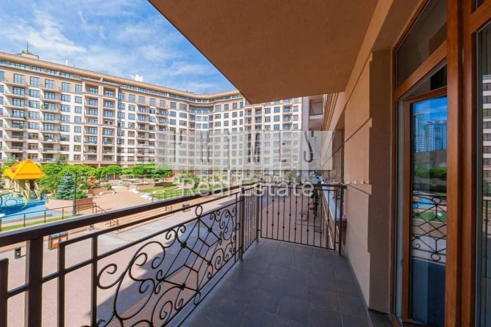 Просторий балкон для відпочинку з виглядом у затишний внутрішній двор з фонтаном
