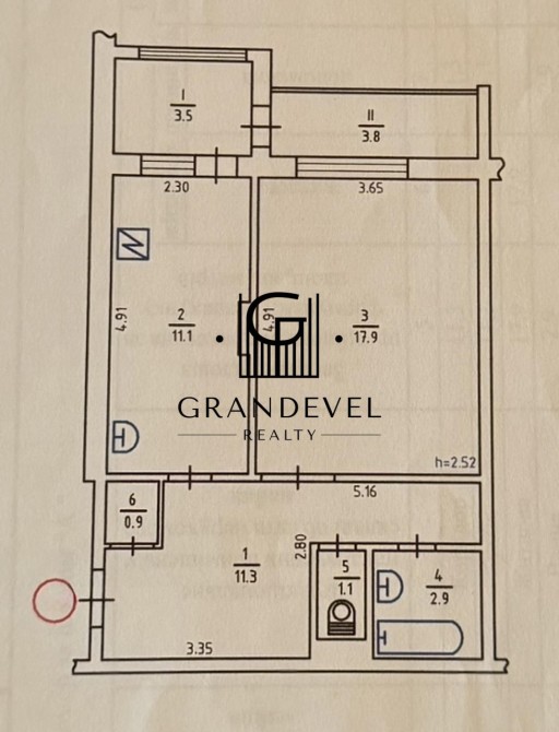 Загальна площа — 52,5 м², житлова — 17,9 м², кухня — 11,1 м².